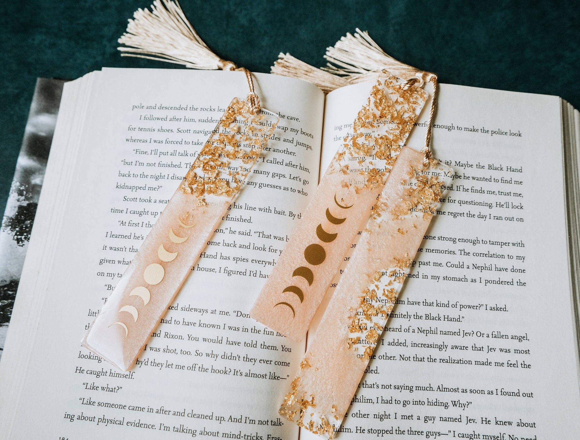Resin bookmark made with peach-colored mica pigment and gold flakes. Gold flakes may be slightly textured on surface. Due to the nature of the mica pigment, bookmarks may have some transparency when held up to the light and minor air bubbles along the edges. Moon phases are added with permanent matte gold vinyl that shines perfectly in the sun. With great care, the vinyl can remain scratch-free for a long time. To clean, wet cloth and wipe gently. Designed for hardcover books. Complete with a matching gold tassel. These are hand-poured, so each bookmark will look slightly unique.